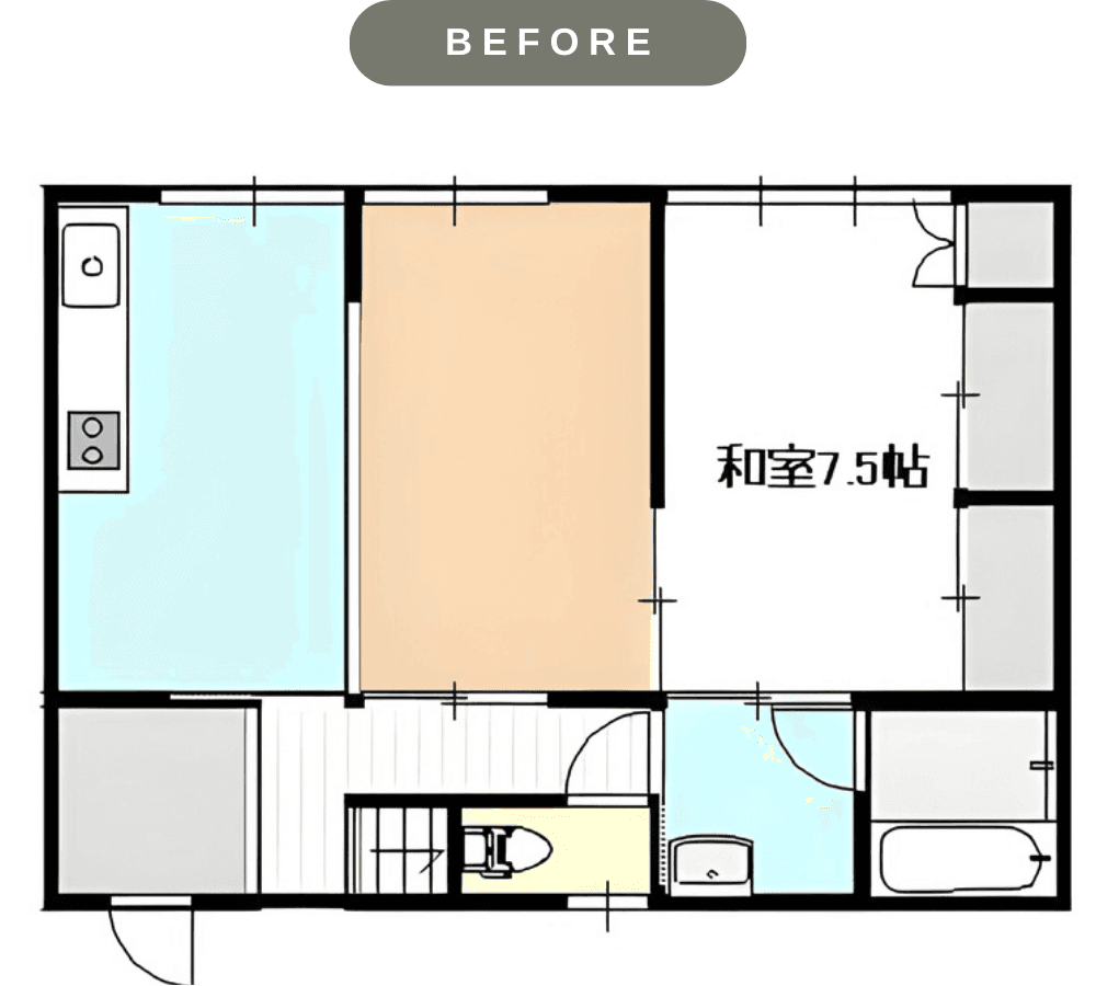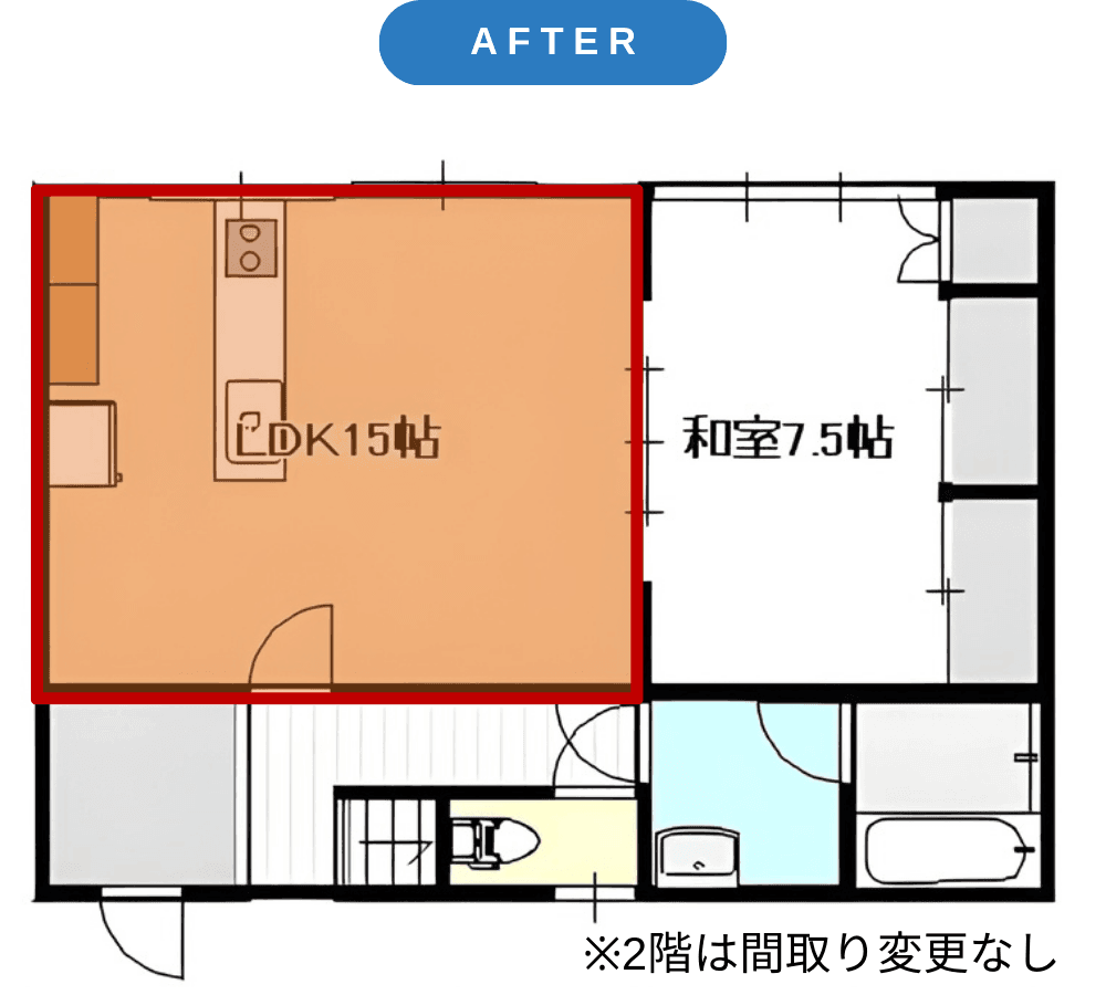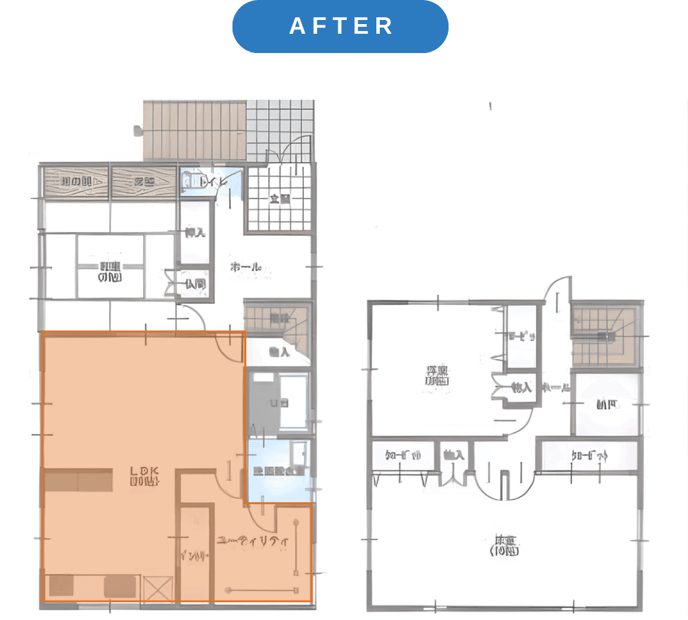 家族が集まるリビングを広く取り、キッチンダイニングと空間が緩やかにつながるように間取りを変更。台所は収納などに自由に使えるスペースへと変更しました。
